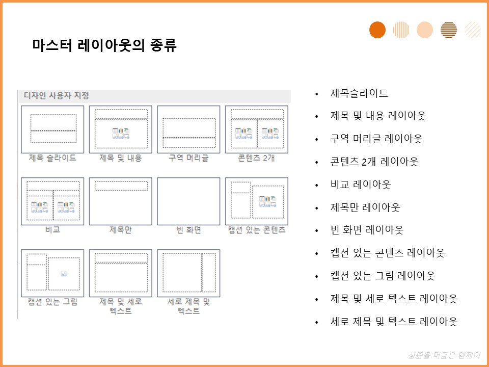 참 보기 싫어서 다 지워버리고 글상자를 삽입하시는 분들이 많죠? 매번 글상자 삽입이나 복사해서 사용하느니 슬라이드 마스터에서 레이아웃 한 번만 편집해두면 두고두고 효자라고 제가 말씀드렸을 겁니다. 11종류의 레이아웃을 살펴보면 각각의 목적이 있는 디자인들입니다. 이중에서도 가장 많이 사용되고 보편적으로 활용하기 쉬운 레이아웃을 최소한으로 알려드릴 겁니다.
