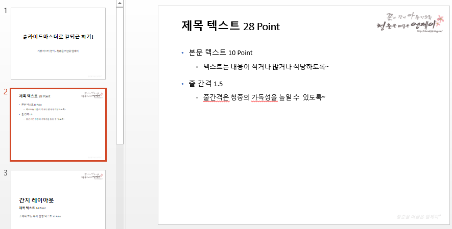 그런 부분을 방지하고 작업시간을 절반 이하로 줄이기 위해서는 슬라이드 마스터를 활용해서 작업하면 되겠죠? ㅎㅎ